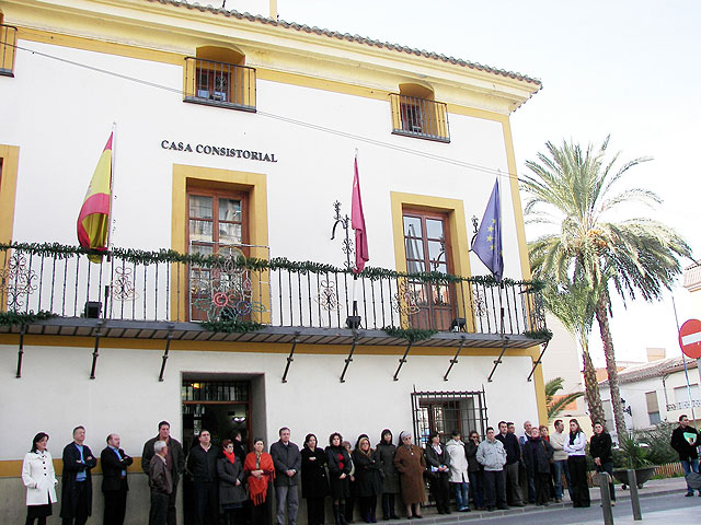 Un centenar de personas entre trabajadores del Ayuntamiento, concejales del Equipo de Gobierno y Alcalde de Archena se han concentrado tal y como estaba previsto en la convocatoria oficial a las 12,00 horas en la puerta principal de la Casa Consistorial para protestar en silencio por este nuevo asesinato de la banda terrorista ETA, perpetrado en la jornada de ayer en el País Vasco.
