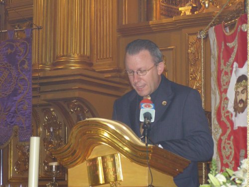 Cristóbal Guerrero, de 82 años, y antiguo párroco de la Iglesia de San Juan Bautista de Archena, realizó este mediodía en esta misma Parroquial un pregón inaugural de Semana Santa muy emotivo y con un profundo fondo religioso. Explicó inicialmente el sentido de cada una de las imágenes que procesionan en casi todos los desfiles de Semana Santa. Principalmente se refirió a la fé de todo creyente y cofrade y relató algunos de los pasajes que más se representan en cualquiera de los tronos que desfilan habitualmente. Destacó asimismo la celebración de la misa como el elemento más básico y esencial de las próximas celebraciones pasionales. En uno de sus apartados de su pregón hizo especial referencia al ‘Desenclavamiento' (uno de los actos de la Semana Santa más típicos y peculiares de Archena) e hizo un sencillo homenaje a las dos familias archeneras que desde hace varias generaciones llevan ayudando a realizarlo.