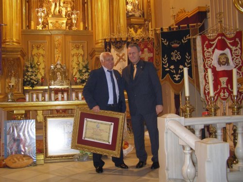 Tras el pregón de Guerrero, el Alcalde de Archena, Manuel Marcos Sánchez Cervantes, y el Presidente del Cabildo Superior de Cofradías de Archena, Juan Pío Abenza, entregaron la Insignia de Oro y un trofeo al Pregonero y al Nazareno del Año, Julio López, de la Hermandad de San Juan Evangelista.