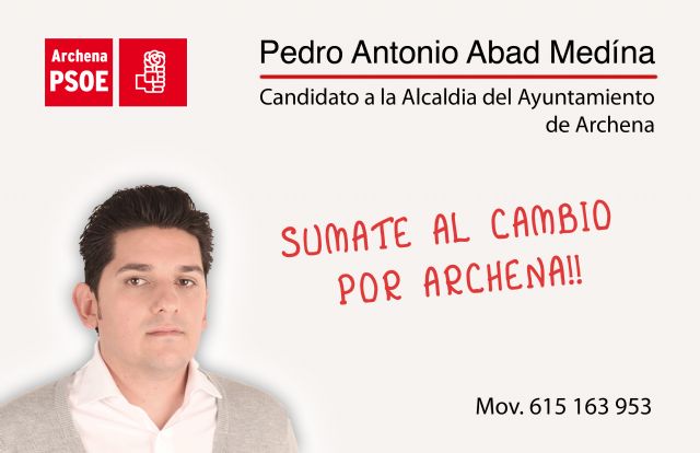 El Candidato a la Alcaldía de Archena, Pedro Antonio Abad, ha presentado públicamente la campaña que desarrollaran durante el mes de marzo para presentarse a todos los ciudadanos de Archena, y con la que se pretende presentar un proyecto que impulse el desarrollo de Archena y que consiga superar la etapa de abandono provocada por la incapacidad de gestión del actual equipo de gobierno.