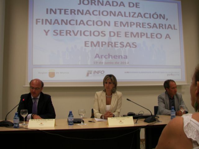 La Alcaldesa de Archena inauguró ayer por la tarde en el salón de actos del Museo de Archena, las Jornadas de Internacionalización, Financiación Empresarial y Servicios de Empleo a Empresas, a las que acudieron principalmente empresarios y emprendedores de la comarca. En ellas intervinieron el Director General del Info, Juan Hernández Albarracín, y el Director General del SEF, Ginés Martínez González, técnicos del departamento de financiación del INFO, miembros del SEF y el Agente de Desarrollo Local, Miguel Palazón.
