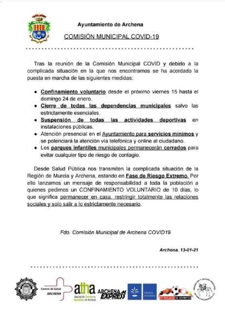 La primera autoridad municipal ha emitido un comunicado oficial donde se explica que desde esa fecha del 15 de enero se cerrarán todas las dependencias municipales, salvo los servicios esenciales, se suspenden todas las actividades deportivas, también la atención presencial en el Ayuntamiento, solo atenderán servicios mínimos, y los parques infantiles municipales permanecerán cerrados.
