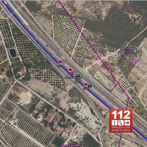 12:24 horas.- Servicios de emergencia han intervenido en un accidente de tráfico ocurrido entre los puntos kilométricos 119-120 de Autovía A-30, sentido Cartagena, cerca de la salida 121 hacia Archena, término municipal de Archena, donde una persona ha resultado herida.