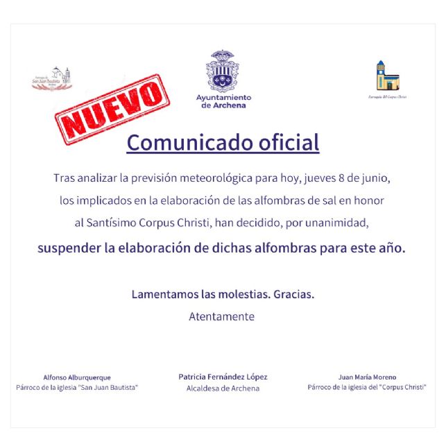 La alcaldesa de Archena, Patricia Fernández, y los dos párrocos de las iglesias de San Juan y Corpus-La Purísima han elaborado un comunicado oficial dando por suspendida la elaboración de alfombras de sal de colores (uno de los actos más importantes de las fiestas) en honor al Patrón, que se celebra hoy, el Corpus Christi.