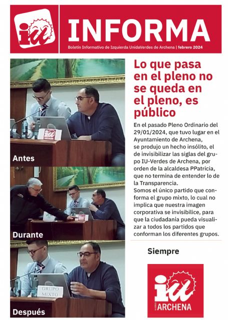 "Lo que pasa en el pleno no se queda en el pleno, es público" señala en portada Antonio Torrano, Concejal de IU-Verdes en el Ayuntamiento de Archena, quién califica de "hecho insólito" lo ocurrido en el pasado Pleno Ordinario del pasado 29 de enero que tuvo lugar en la Casa Consistorial de Archena, tratando de invisibilizar las siglas del grupo municipal de Izquierda Unida-Verdes, por orden de la alcaldesa "PPatricia", quien según el edil de la formación municipalista "no termina de entender lo de la Transparencia".